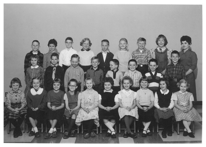 Top Row: Mrs. Senti (teacher), Tommy Stone (?), David Hansen, Beverly Eide, Keith Isachsen (?) , Linda Jeffrey (?) , Albert Brunner, John Bergman, Sheila Evenson, Ernest Barstad.